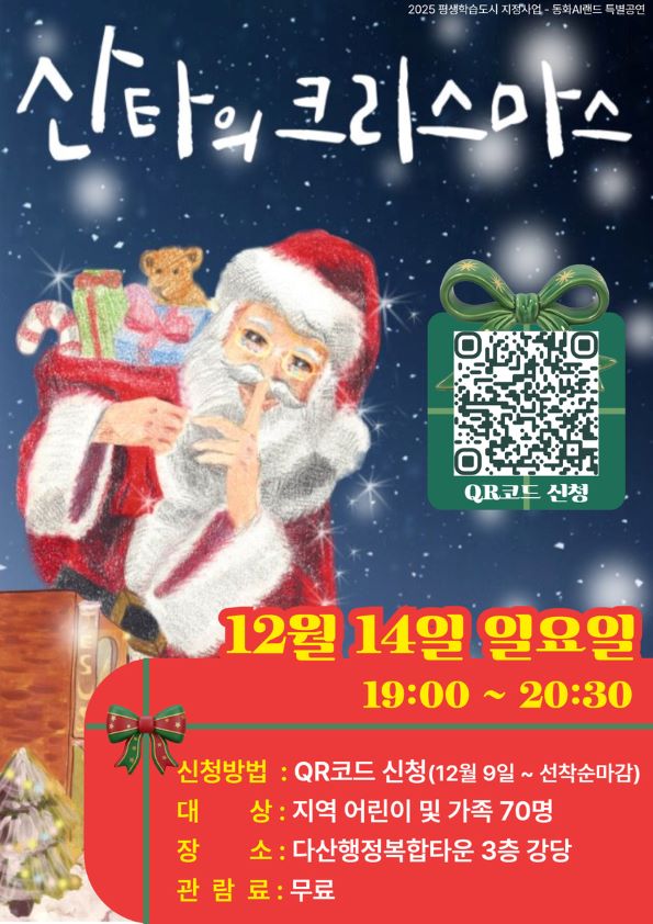 | 제목 | 2025 평생학습도시 지정사업-동화AI랜드 특별공연 "산타의 크리스마스"관람 신청 | ||||